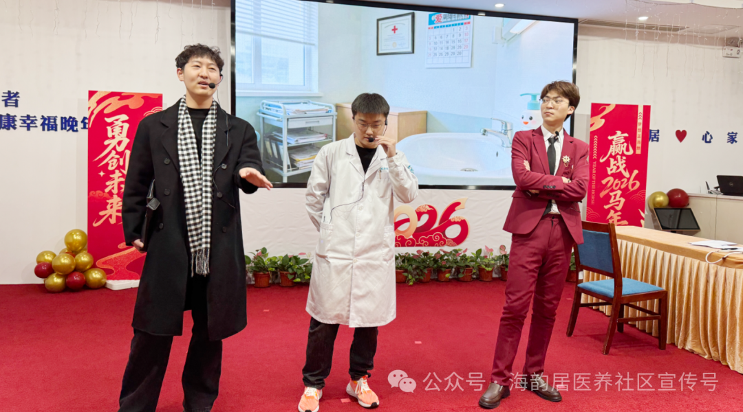 海韵居员工们也各显神通,献上精心准备的节目:中医科、康复科的趣味小品《总裁请就诊》幽默接地气,让长辈们笑个不停;贾院长演唱的《花又落》温柔动人,尽显岁月静好;后勤团队的舞蹈《新年快乐》活力满满;护理负责人潘慧敏、宋红明的相声《四大名著》包袱不断......从临床一线到后勤保障,从医护人员到管理团队,每一个节目都藏着对长辈们的真心与敬意,没有华丽的编排,却用最朴实的演绎传递着最真挚的温暖。